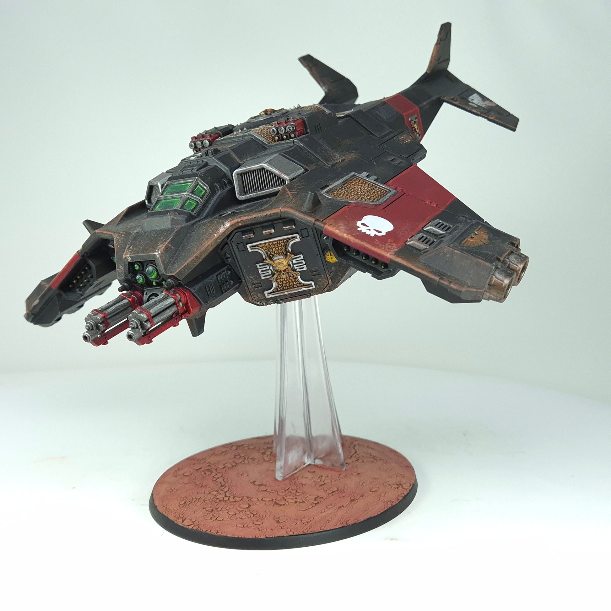 This Corvus Blackstar is painted to a tabletop standard. The Deathwatch flyer is fully ready for deployment in the iconic black and red colour scheme.