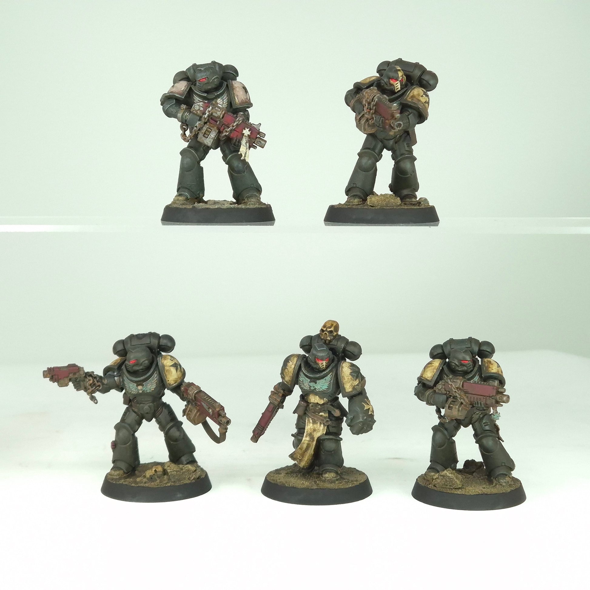 Five Black Templars Intercessors painted to a tabletop standard in a grimdark style. A solid troop choice painted in a suitably dark and grimy finish.
