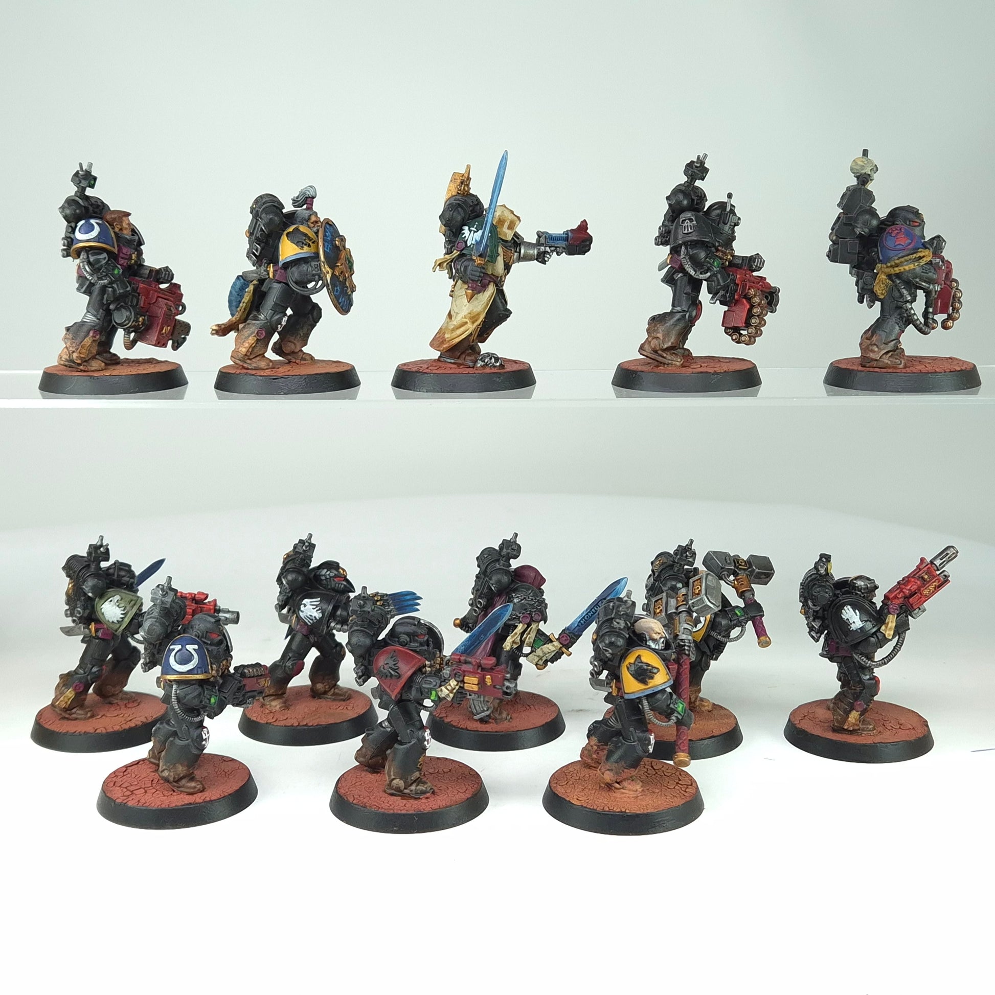 A group of 13 Deathwatch Kill Team Veterans painted to a tabletop standard. Each model reflects the mixed-chapter heritage of the Deathwatch, with varied shoulder pads and weapon options.
