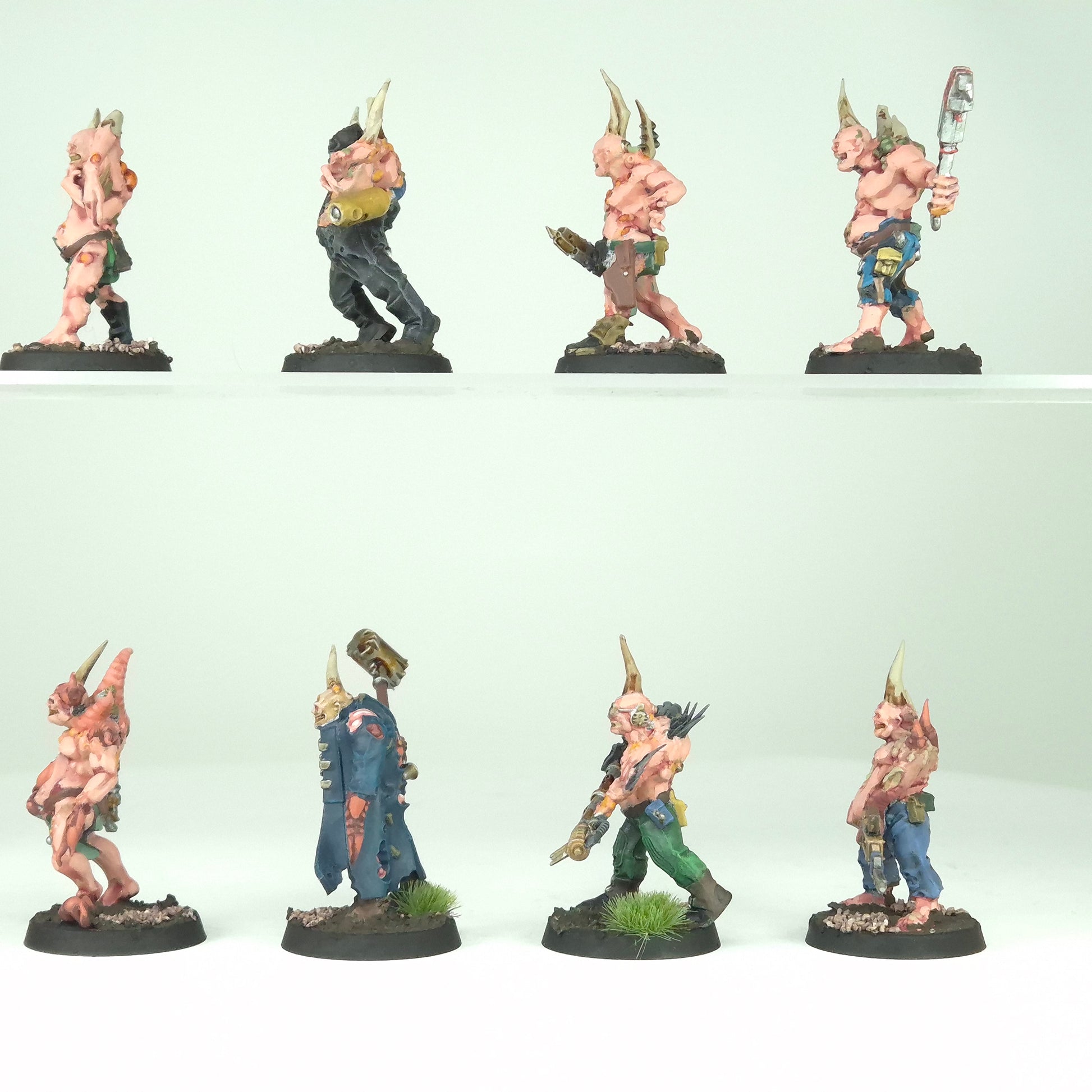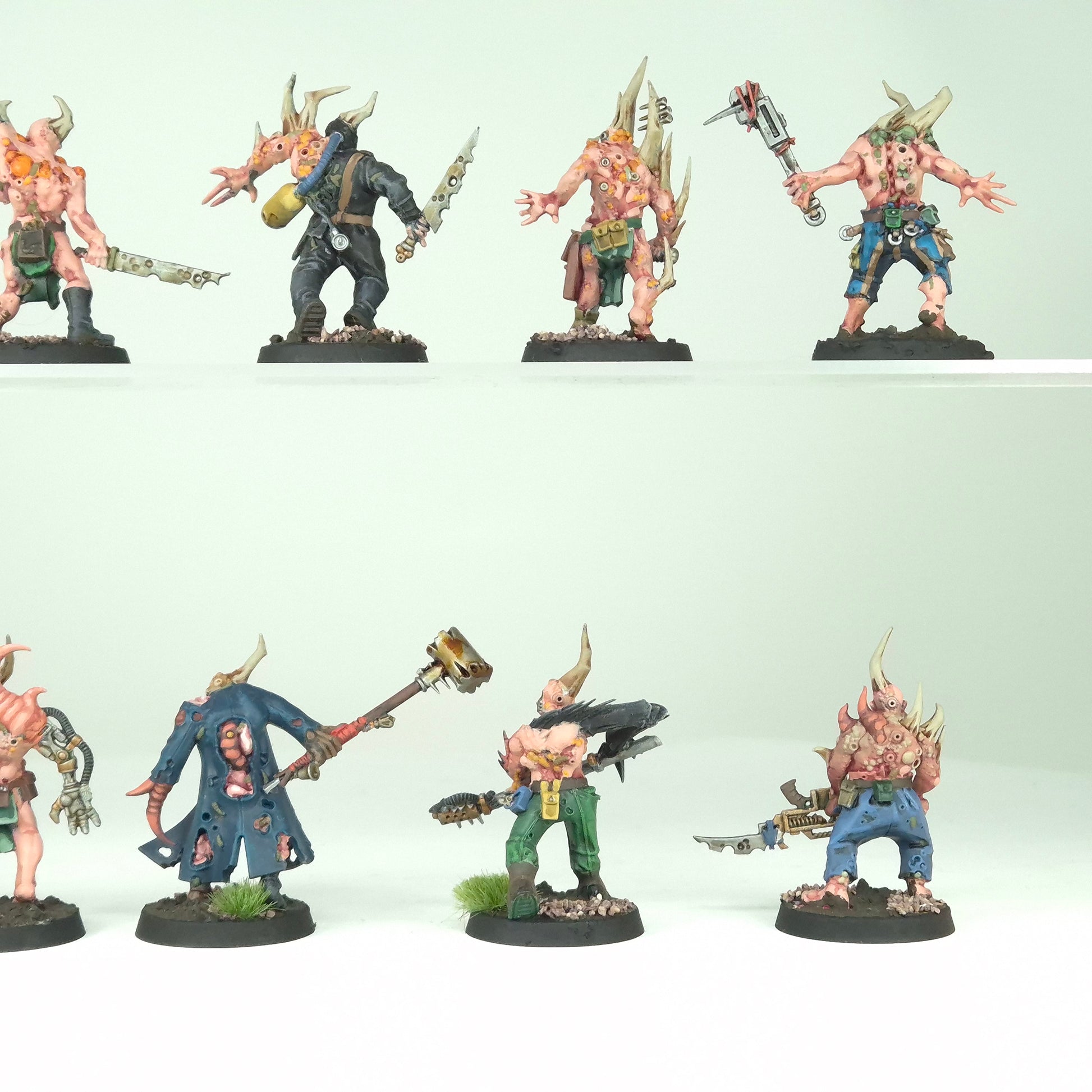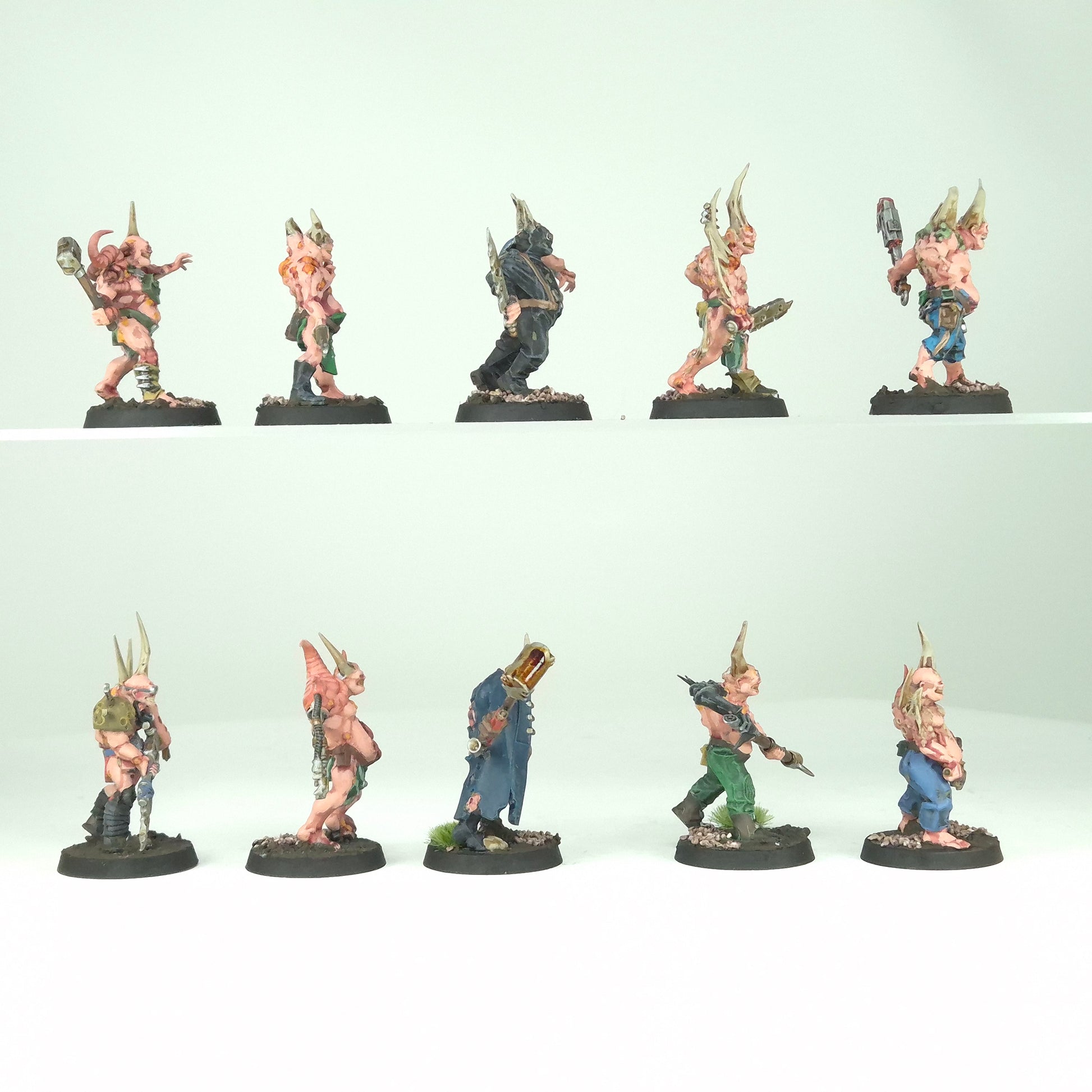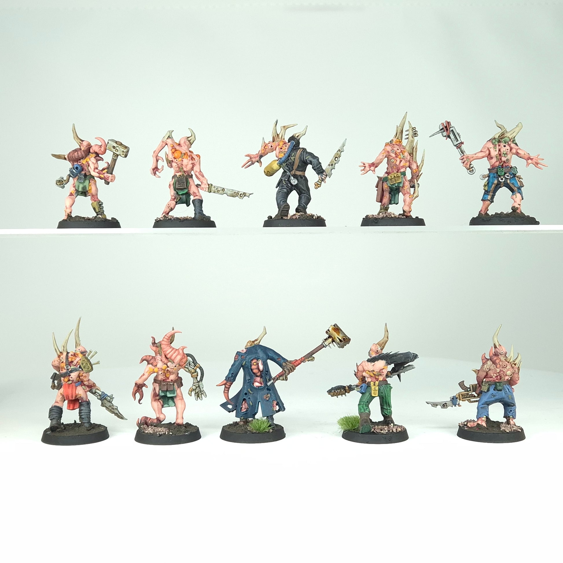Ten Poxwalkers painted to a solid tabletop standard. Their grotesque features, mutated limbs, and decaying clothing are picked out with strong contrast.